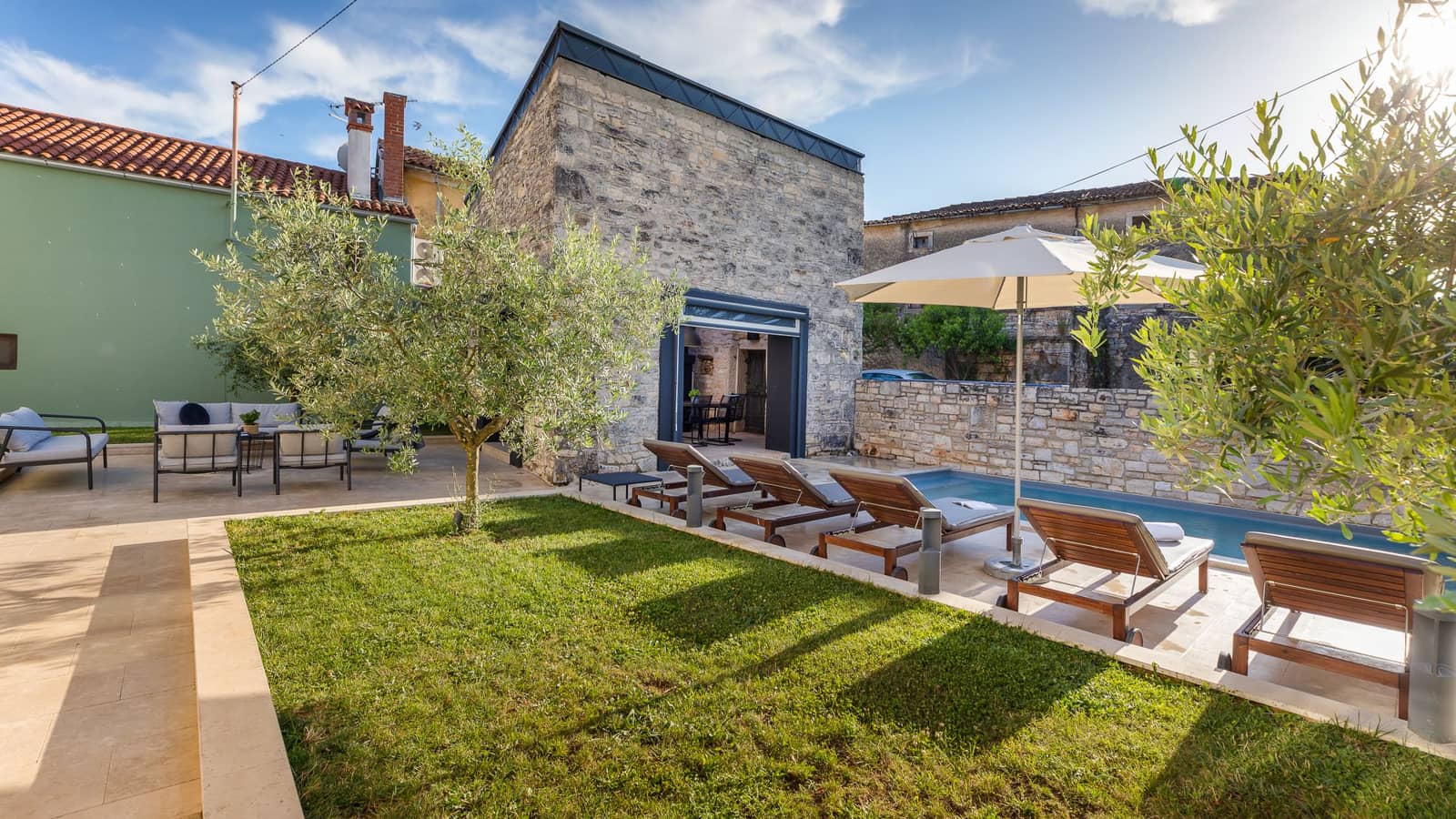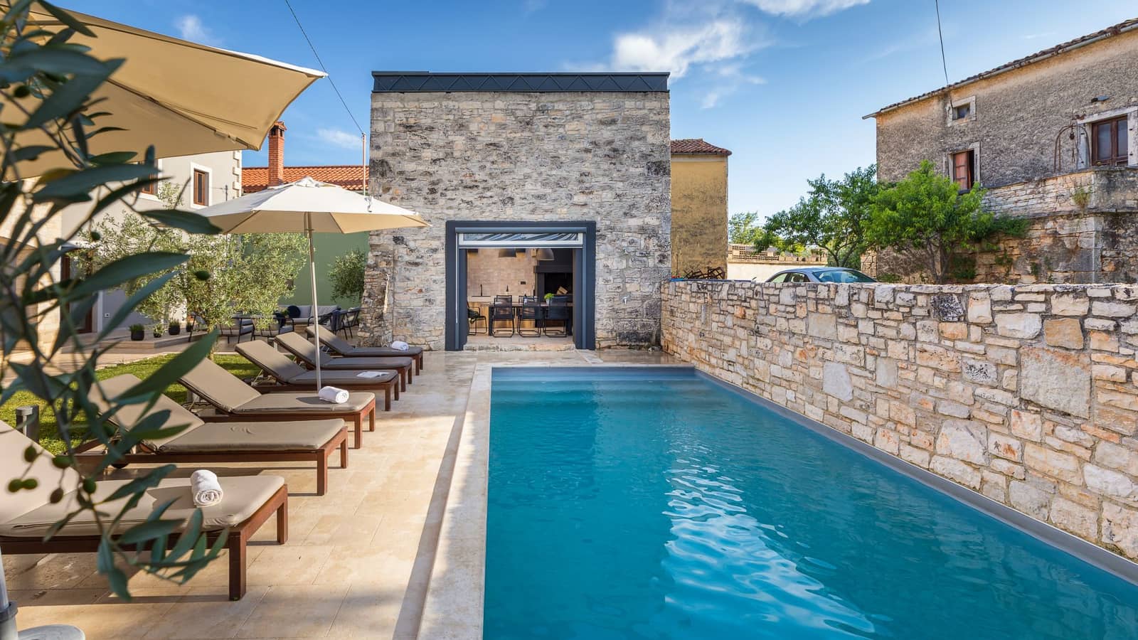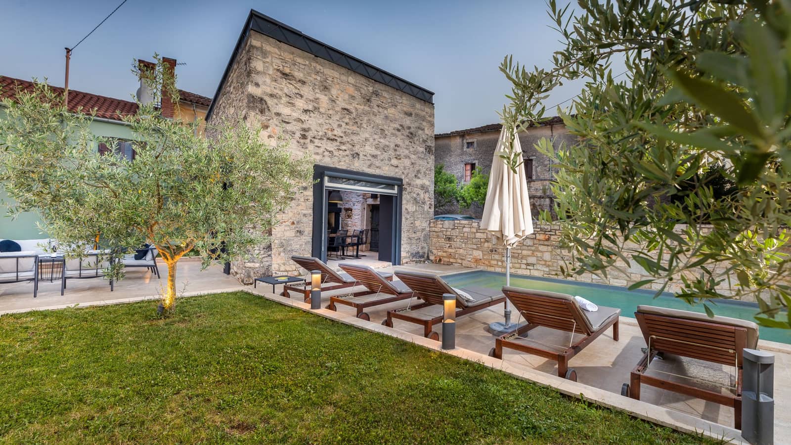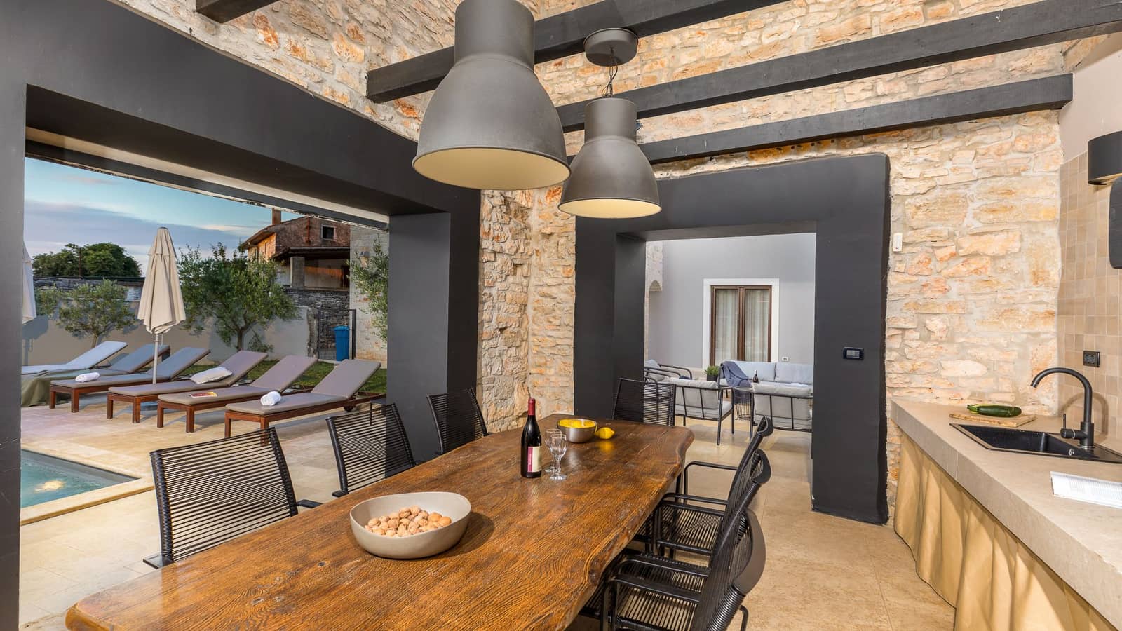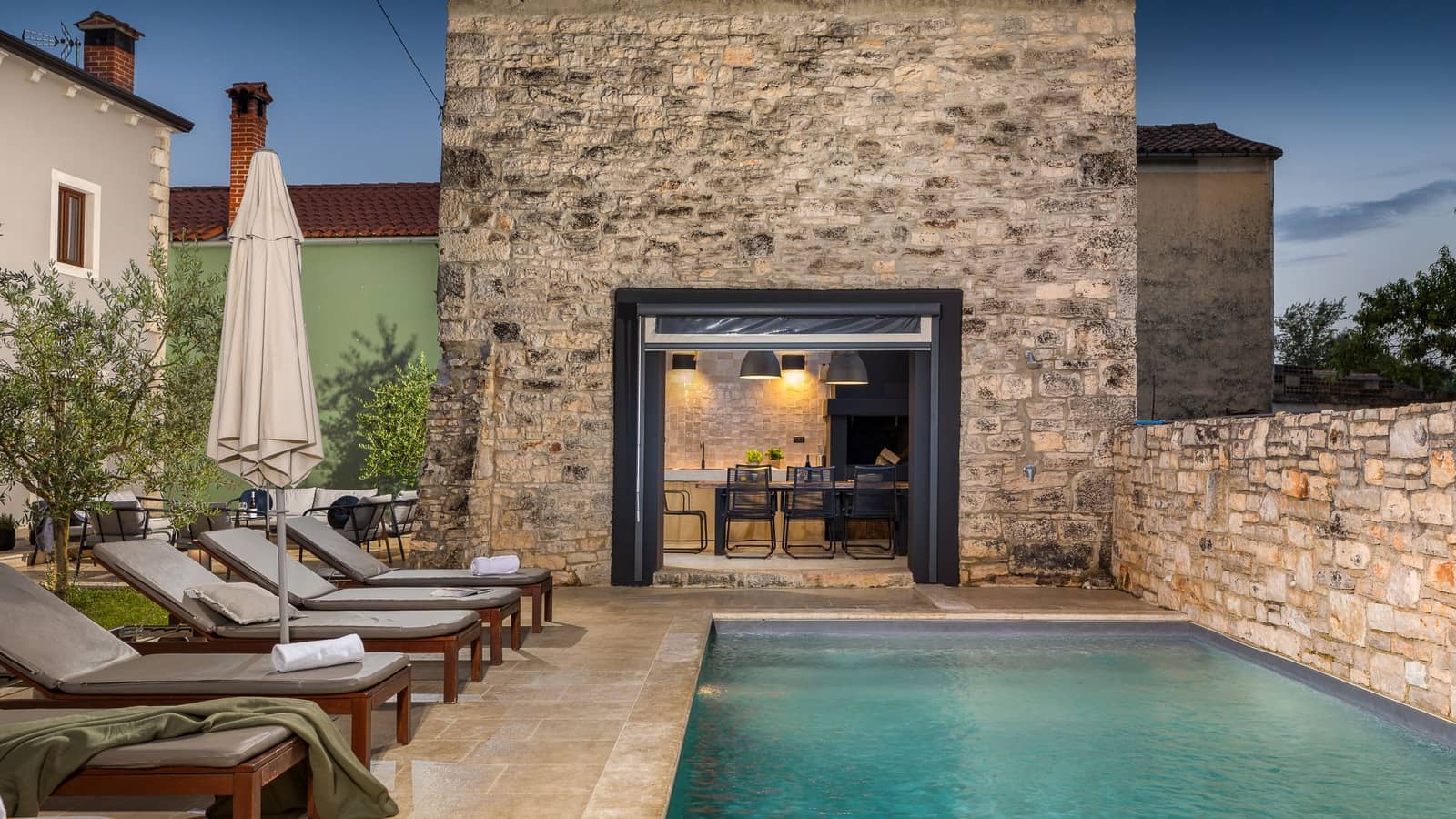 L'espace extérieur est tout aussi accueillant, avec une piscine privée entourée de chaises longues et un jardin paysager - l'endroit idéal pour se détendre.